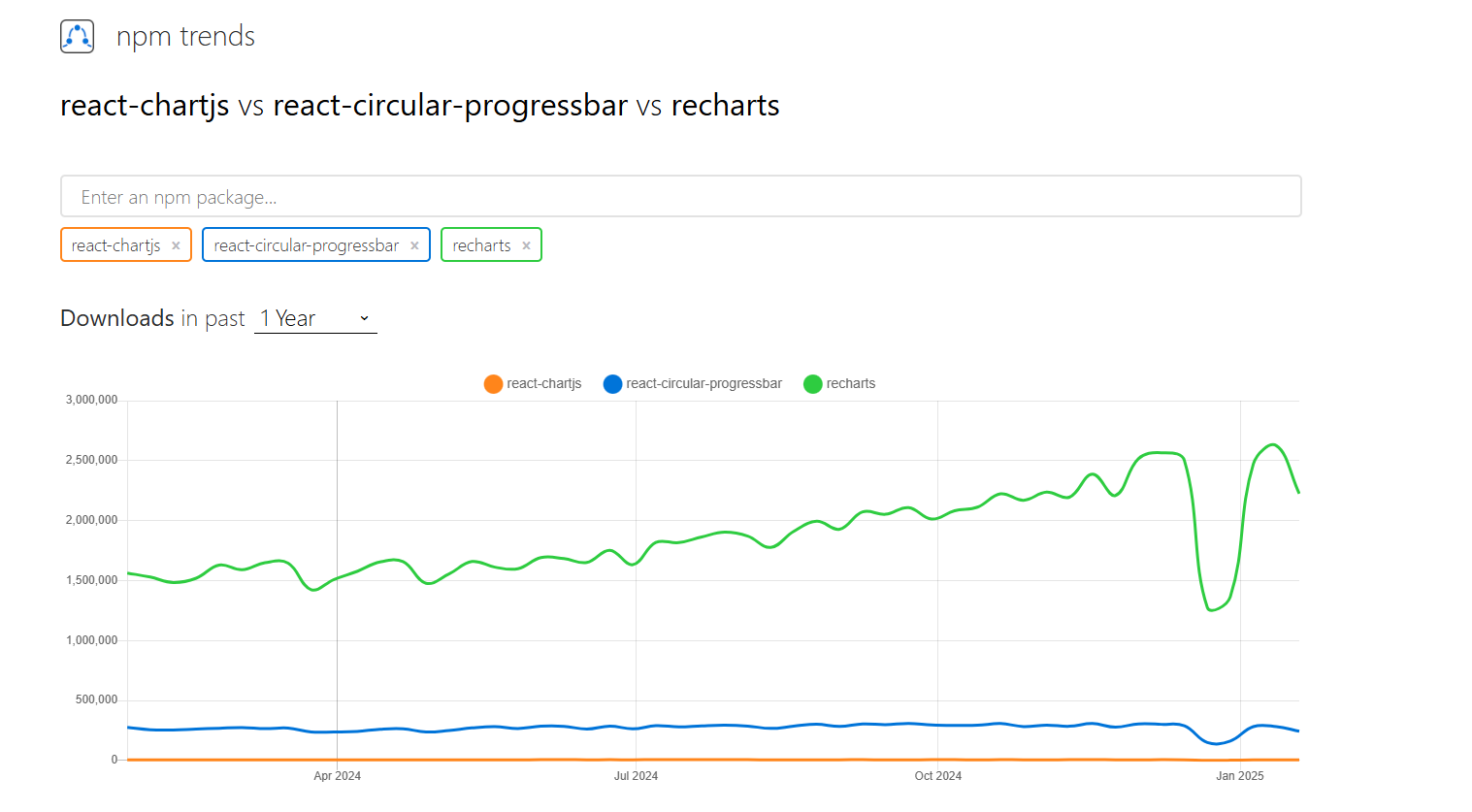 1️⃣ 여러 차트 라이브러리의 다운로드 수 추이를 비교한 결과, Recharts가 가장 활발하게 사용되고 있으며, 커뮤니티의 신뢰도가 높다고 판단했습니다.