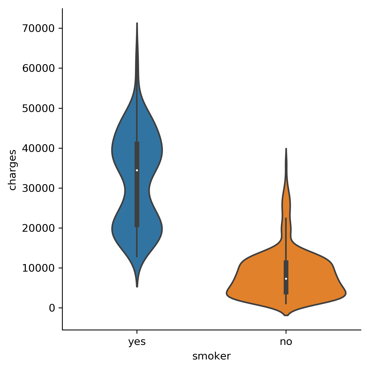 다음과 같이 흡연 여부 카테고리에 따라 보험금을 살펴볼 수 있는 그래프를 그려보세요.
