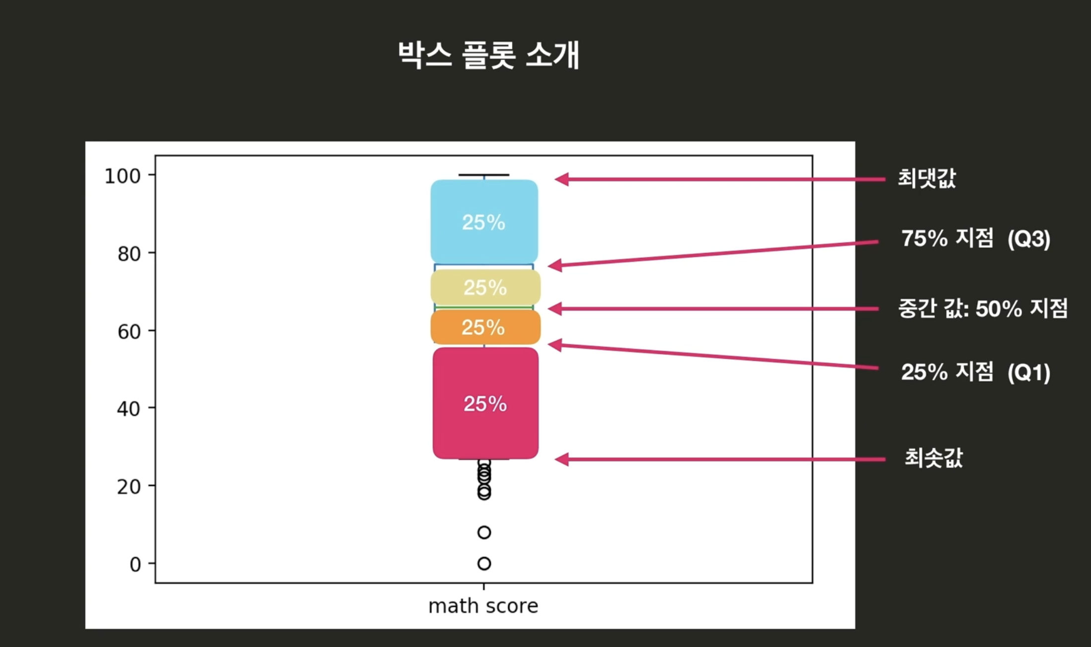 가운데는 박스(box)라 부르고, 위 아래 가로 선은 수염처럼 생겨서 위스커(whisker) 라고 부름