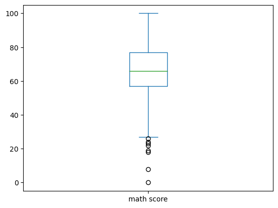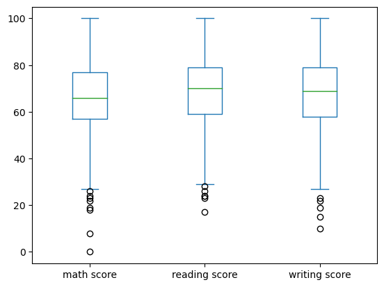 df.plot(kind='box', y=['math score', 'reading score', 'writing score'])