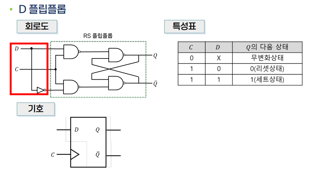 - 저장 요소로 플립플롭(flip-flop)을 일반적으로 사용하며, 가장 많이 사용되는 순서논리회로