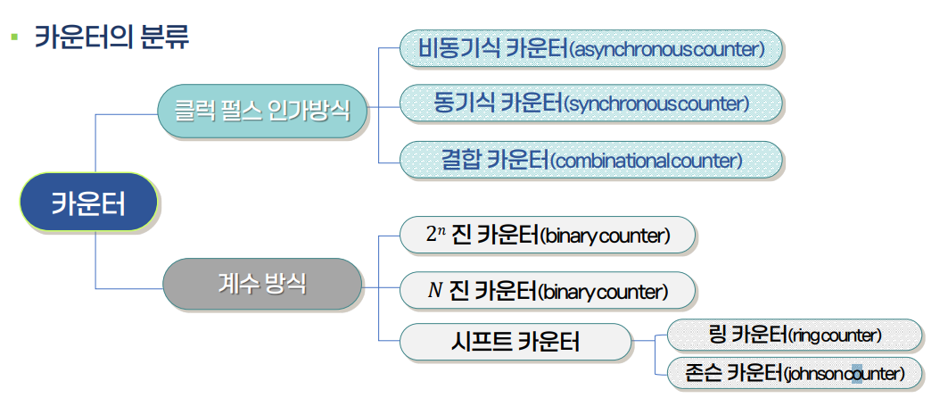 - 카운터를 나타낼 때는 비동기식 2진 카운터, 동기식 10진 카운터 등으로 표현