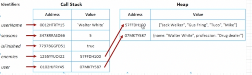 기본적으로 Javascript에는 원시 타입에 대한 값을 저장하기 위해 Call Stack 메모리 공간을 사용하지만 참조 타입의 경우 Heap이라는 별도의 메모리 공간을 사용한다. 이 경우 Call Stack은 개체 및 배열 값이 아닌 Heap 메모리 참조 ID를 값으로 저장한다.