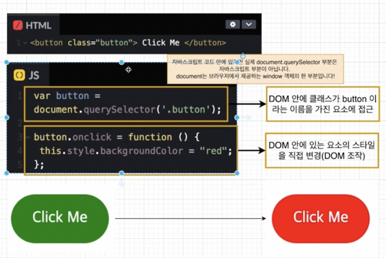 또한 위에서 보는 웹 페이지를 이루는 요소들을 자바스크립트가 이용할 수 있게끔 브라우저가 트리구조로 만든 객체 모델을 의미한다.