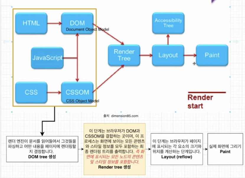 Render Tree를 만들어서 Paint까지 하는 과정이 비용적인 면이 많이 들기 때문에 이 부분에서 성능최적화가 필요하다.