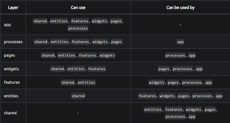 ๊ธฐ๋ฅ ๋ถํ ์ค๊ณ์ ์ฃผ์ ํน์ง ์ค ํ๋๋ ๊ณ์ธต ๊ตฌ์กฐ์ด๋ค. ์ด ๊ตฌ์กฐ์์ features ๋ ์ด์ด๊ฐ entities ๋ ์ด์ด๋ณด๋ค ๋ ์์ ์๊ธฐ ๋๋ฌธ์ entities ๋ ์ด์ด๋ features ๋ ์ด์ด์ ๊ธฐ๋ฅ์ ์ฌ์ฉํ ์ ์๋ค. ๋ง์ฐฌ๊ฐ์ง๋ก features ๋ ์ด์ด๋ widgets ๋ ์ด์ด๋ processes ๋ ์ด์ด์ ์ปดํฌ๋ํธ๋ฅผ ์ฌ์ฉํ ์ ์์ผ๋ฉฐ, ์ ๋ ์ด์ด๋ ์๋ ๋ ์ด์ด๋ง ํ์ฉํ ์ ์๋ค. ์ด๋ ํ ๋ฐฉํฅ์ผ๋ก๋ง ํฅํ๋ ์ ํ์ ์ธ ํ๋ฆ์ ์ ์งํ๊ธฐ ์ํจ์ด๋ค.