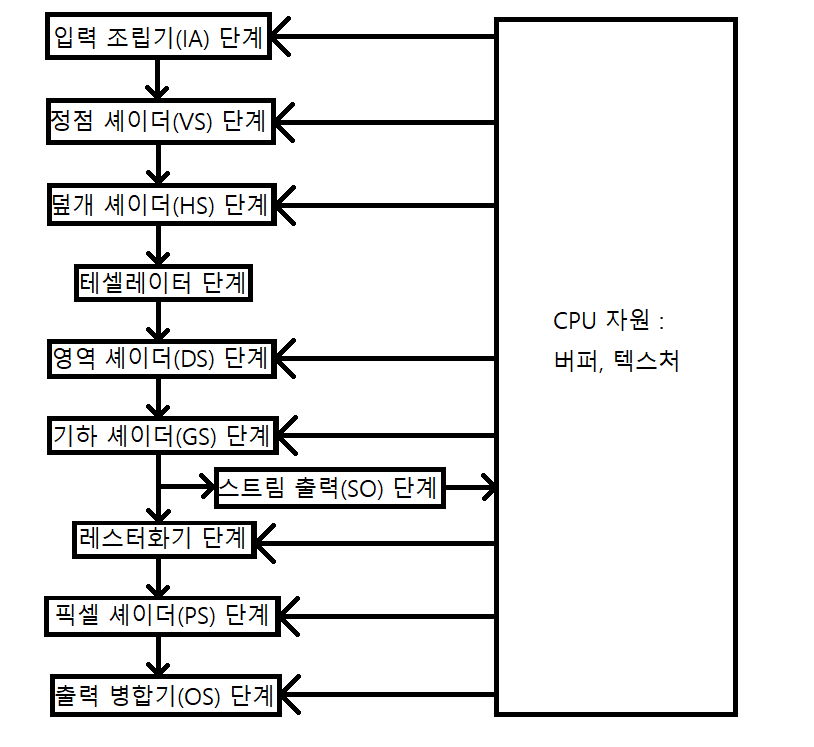 왼쪽이 렌더링 파이프라인을 구성하는 단계, 오른쪽은 그 단계들과 관련된 GPU 메모리 자원들을 나타냈다. 자원 메모리 풀에서 파이프라인의 단계로 가는 화살표는 그 단계가 자원을 입력으로 사용할 수 있음을 뜻하고, 단계에서 자원으로 가는 화살표는 그 단계가 GPU 자원에 자료를 기록할 수 있음을 뜻한다. 양방향 화살표는 GPU 자원을 읽기도 하고 쓰기도 한다는 뜻이다. 하지만 보통은 자원으로 입력을 받는다.