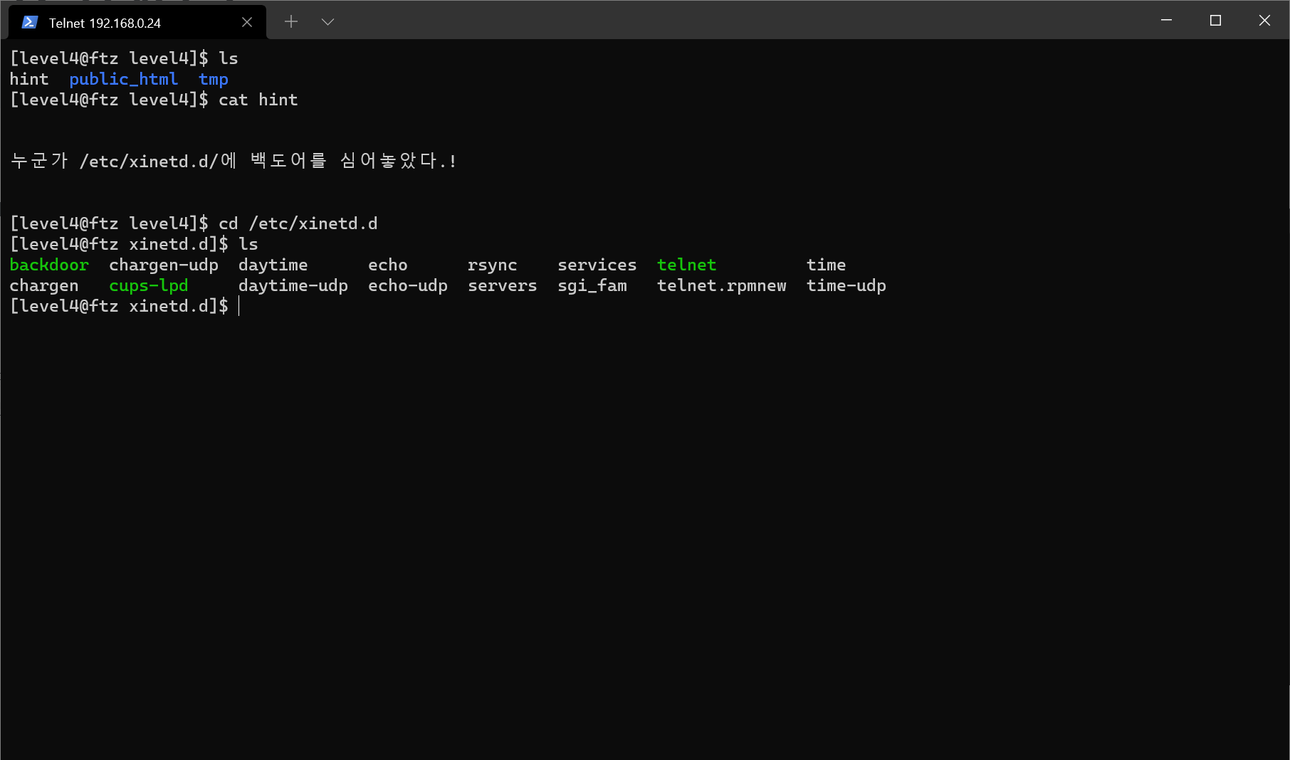 /etc/xinetd.d에 백도어가 있다고 한다. xinetd는 리눅스 슈퍼 데몬으로, 인터넷 서비스의 연결 및 제어를 담당한다.