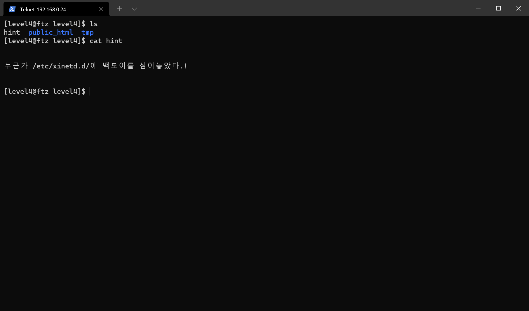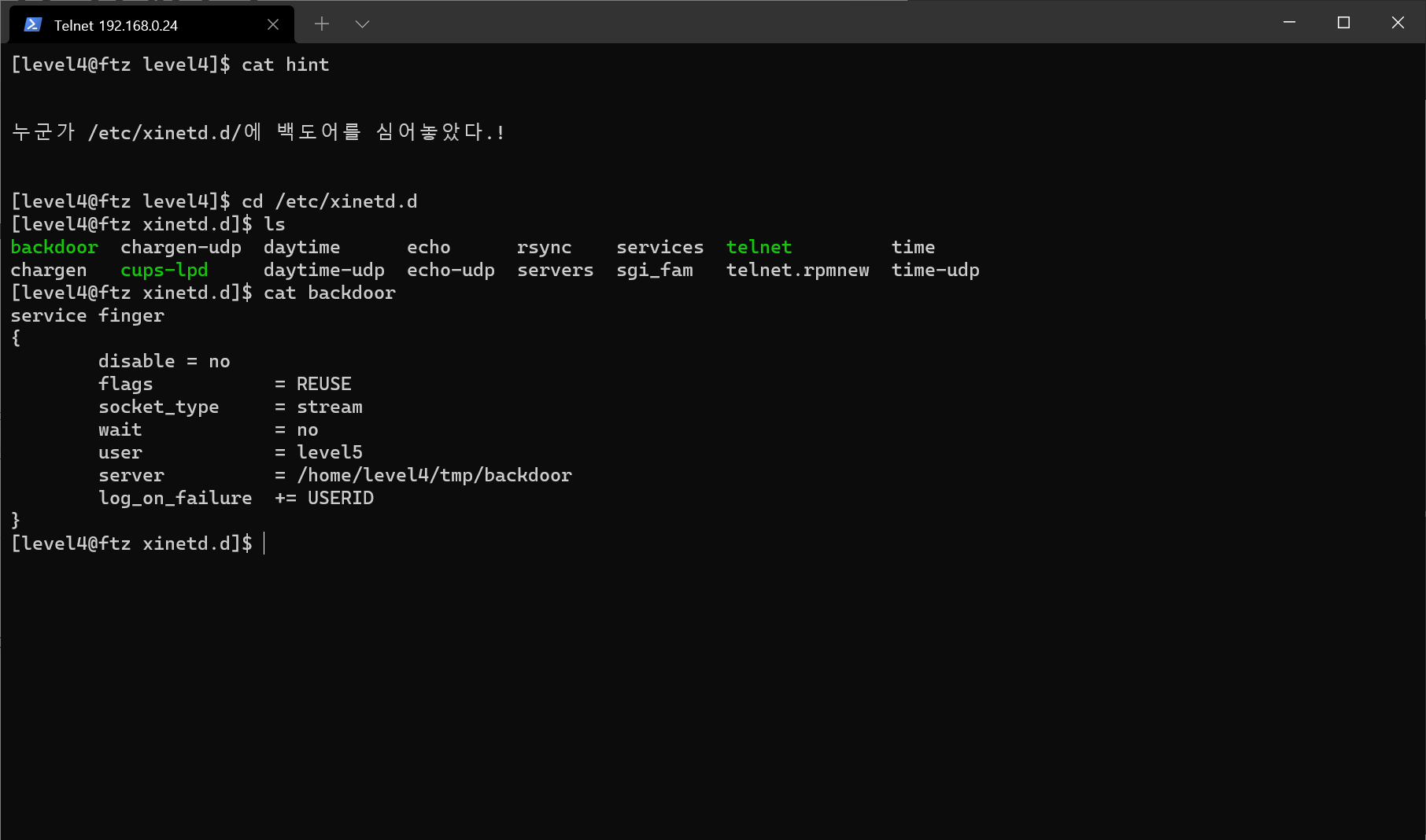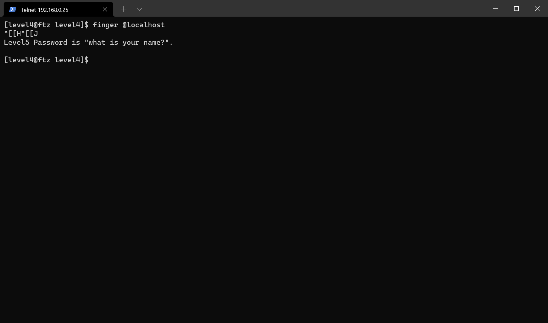 이번에도 finger의 인자가 무엇인지는 상관이 없고, 문제의 의도는 level5의 권한으로 /home/level4/tmp/backdoor가 실행되게 하는 것이기 때문에 특별한 호스트가 아닌 localhost(접속해 있는 호스트)를 사용할 것이다.