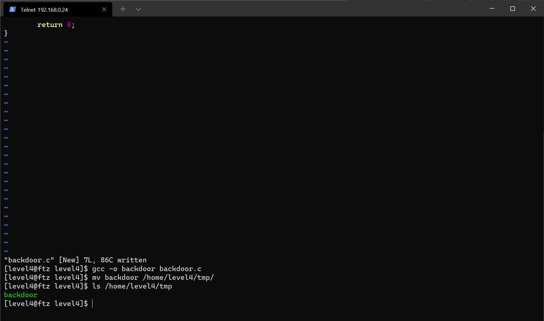 소스 코드를 작성하고 gcc로 컴파일한 후 /home/level4/tmp 경로로 옮겨 주자.