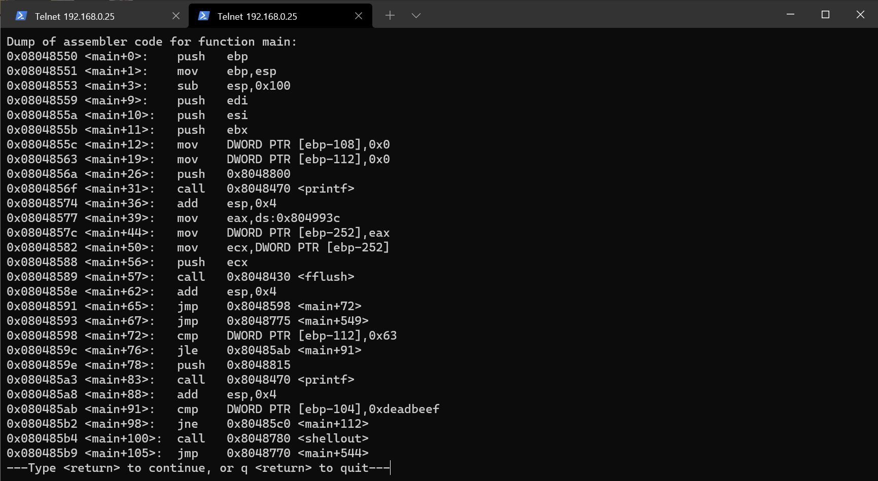<main+91>을 보면 [ebp-104]와 0xdeadbeef를 비교하고 있다. 즉 check가 위치한 지점은 [ebp-104]라는 것을 알 수 있다.