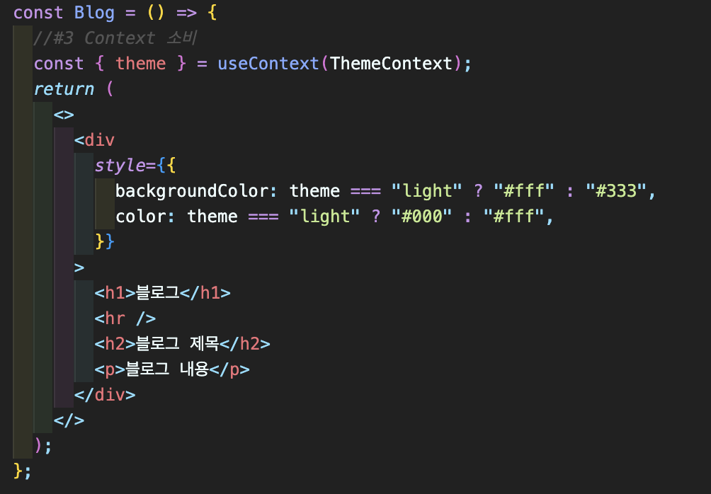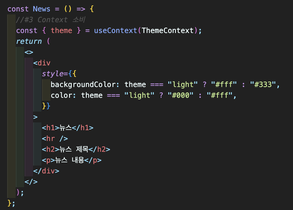 Blog와 News를 포함하는 Contents 컴포넌트를 추가 ➡️ Contents 컴포넌트는 theme 변수를 필요로 하지 않지만, 하위 컴포넌트에게 전달하기 위해서 props 변수로 받아서 처리