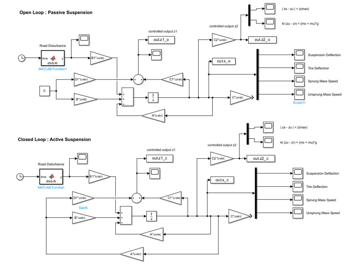 Simulink를 통해 Open loop와 Closed Loop에서의 suspension을 설계한다. 또한, Closed loop의 경우 state-estimator을 이용하여 k값을 구하고 (원하는 사양의 시스템을 만들도록 pole을 설정하는 것이 중요하다) 그에 따른 X1~X4의 결과와 Controlled Output을 비교한다.