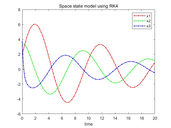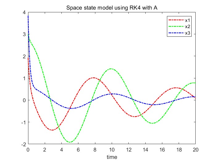 A=[0 1 0; 0 0 1; -2 -1 -5] 라고 주어졌을 때, Runge-kutta 4th 방식을 이용하여 설계한 코드이다. 이때 matrix 연산을 바로 넣지 않고, function에 직접 A*x 를계산한 matrix를 삽입하였다. 이는 연산식이 복잡해지면 새로운 함수를 정의하여 matrix의 연산식을 그대로 넣는 것으로 대체할 수 있다. (뒤에서 다룰 예정.)