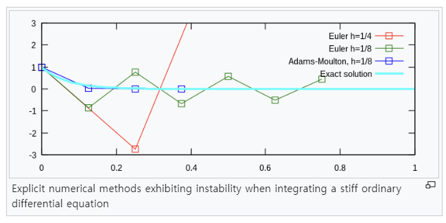 이렇게 사용하면, 계산에 시간 소요가 굉장히 늘어나지만 그에 반해 explicit 한 것의 불안정성을 cover할 수 있다는 장점이 있다. 가끔은 step size를 불가능할 정도로 줄이지 않는 이상 발산하거나 정확하지 않는 수치로 근사화 되는 경우의 equation이 존재하는데, 그때는 explicit한 방법이 아닌 implicit한 방식을 사용하여 값을 정밀하게 근사화하여 찾을 수 있도록 한다.