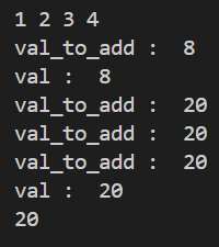디버그를 찍어봤더니 내가 원하는 거랑 약간 다른 식으로 동작하고 있음. 계산 4번 하는 건 ok. 근데 왜 val_to_add가 다 동일하게 20이 나오지?