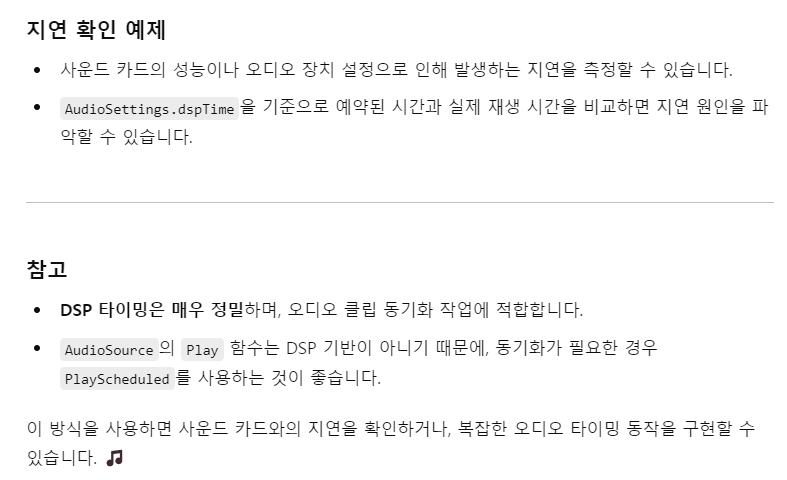 Streaming 옵션으로 설정된 파일은 디스크에서 데이터를 읽어오는 동안 딜레이가 발생할 수 있습니다. 이를 방지하려면 가능한 한 짧은 파일에 대해서는 Decompress on Load를 사용하세요.AudioSettings.dspTime을 사용해 사운드 카드의 지연 여부를 확인하거나, 품질이 낮은 오디오 장치를 사용하는 경우 발생할 수 있는 지연을 테스트하세요.