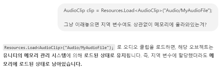 Resources.Load를 통해 특정 오디오 파일을 미리 로드해 둘 수도 있습니다.