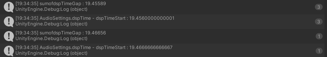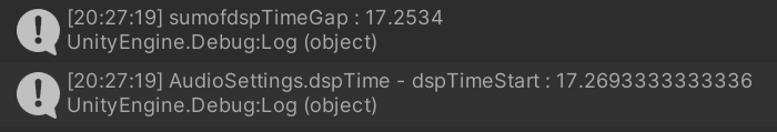 Update()마다 “이전 프레임의 DSP 시간”과 “현재 DSP 시간”의 차(dspTimeGap)를 계산하여 이동하는 경우, 프레임 레이트가 들쑥날쑥할 때 부동소수점 연산에서의 미세한 오차가 누적될 수 있습니다.double(DSP 시간)에서 float(Unity 내 대부분의 연산)로 변환되는 과정에서도 정밀도 손실이 발생할 수 있습니다.AudioSource.Play()가 시작 지점을 약간씩 다를 수 있음