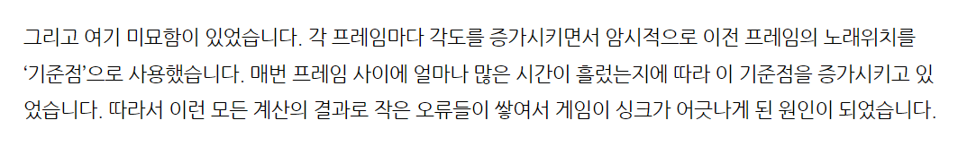 이렇게 하면, 각 프레임 사이의 미세한 오차가 누적되지 않고 매 프레임마다 ‘이미 재생된 절대 시간’으로부터 좌표를 바로 구하기 때문에 박자가 어긋나는 현상이 크게 줄어듭니다.