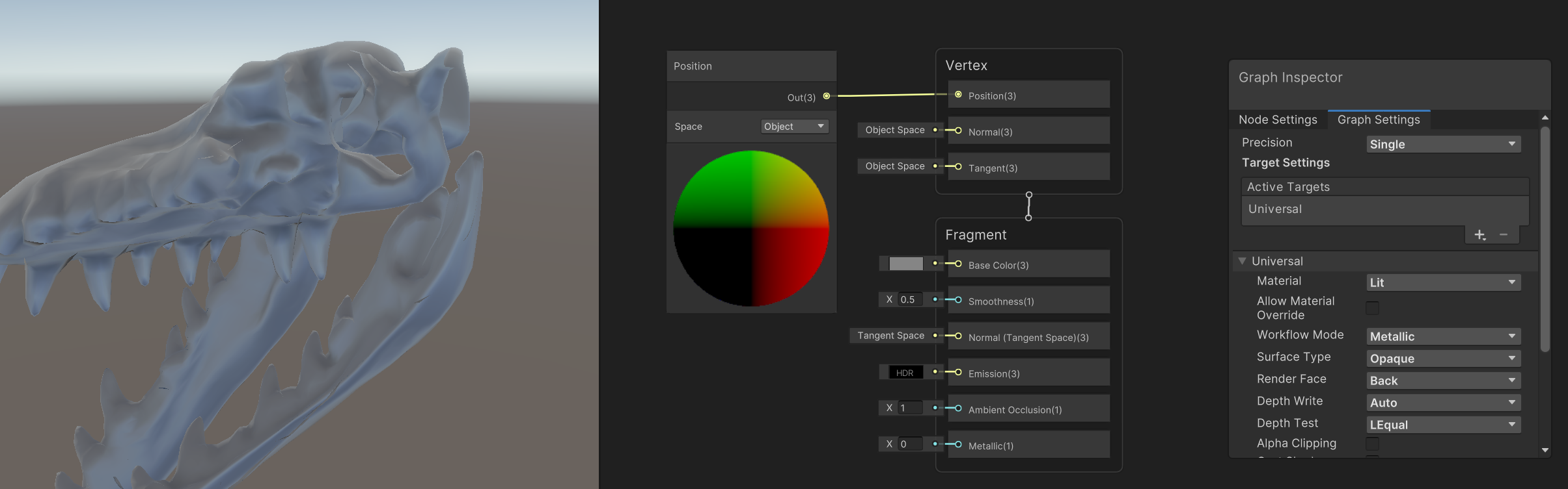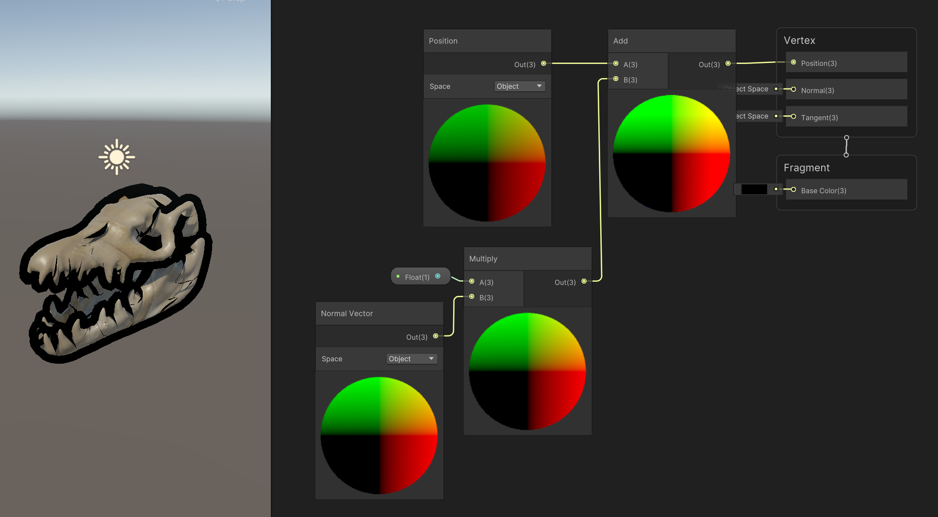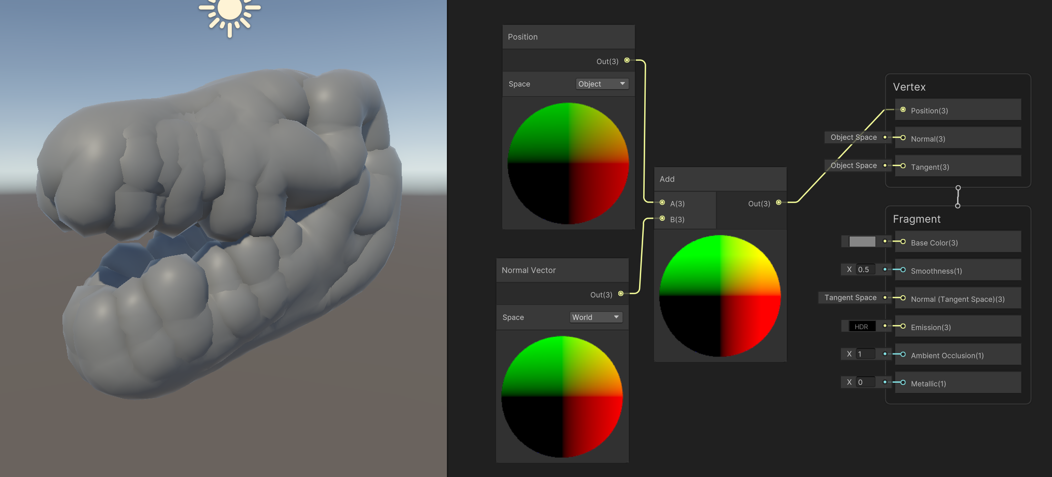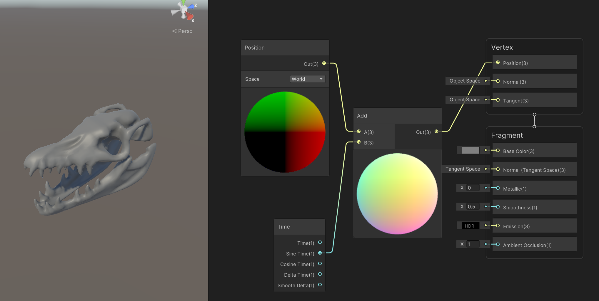 Vertex Shader의 Position에 Sine Time을 더한 Position 노드를 연결하면 모델이 움직이는 걸 확인할 수 있다.