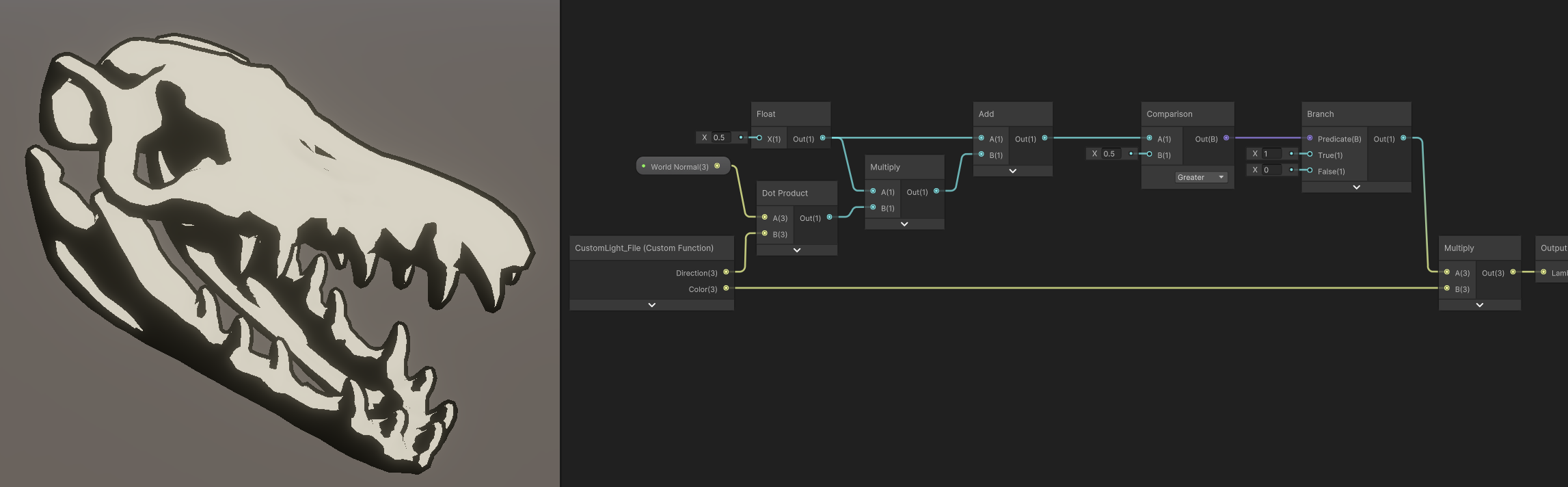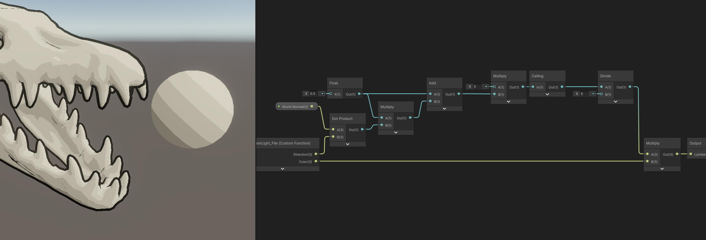 sub graph로 만들었던 Lambert를 복사하여 이름을 Toon으로 바꾸고 공식을 Half Lambert로 바꿔준다.