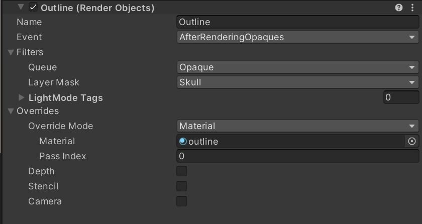 Skull 레이어에 해당하는 오브젝트만 렌더 피쳐로 한 번 더 그려서, outline 머테리얼로 덮어쓰는 작업을 한 것.