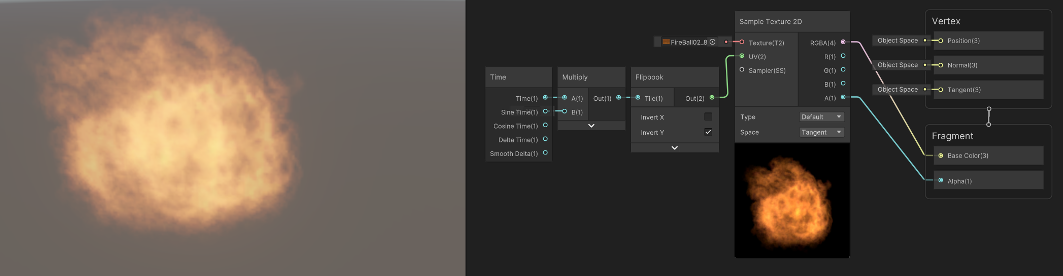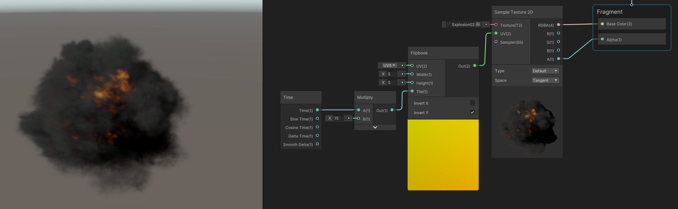 Time을 곱하고 XY를 각각 5,5로 해준 Flipbook 노드를 연결하면 이미지가 애니메이션화 된다.