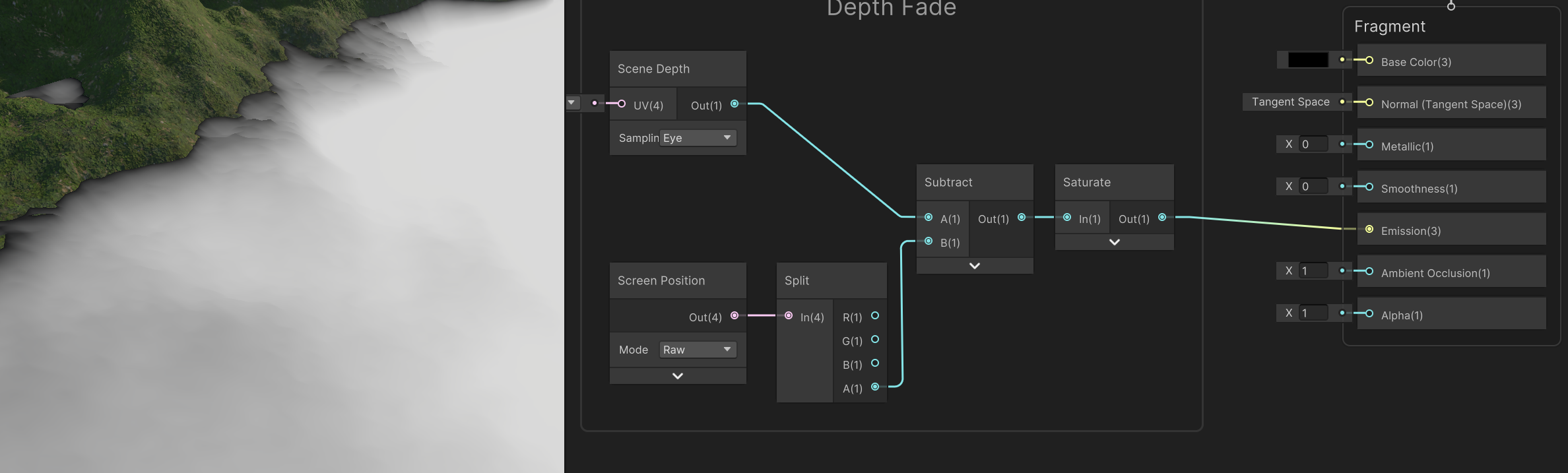 기존 셰이더에서 Alpha 값에 Depth Fade를 넣어주면 경계면 부분이 부드럽게 연결된다
