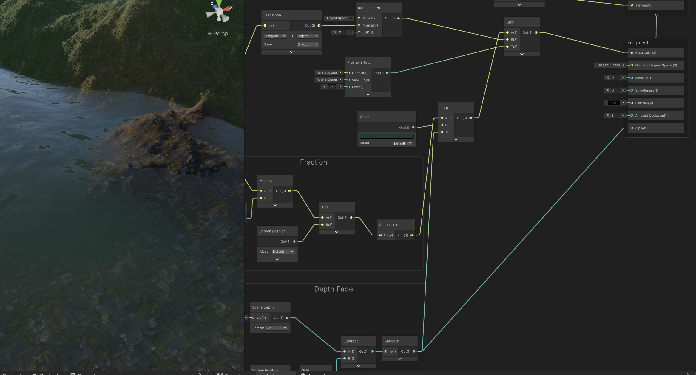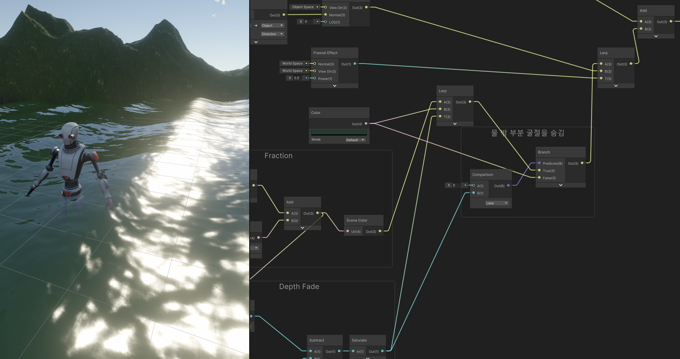 Comparison 노드로 Depth Fade가 0보다 크냐 작냐를 통해 물보다 카메라에 가까이 있다면 굴절 없이 그냥 그려준다.