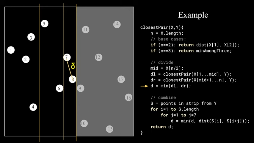 : d는 strip 왼쪽과 오른쪽 점들의 최소 거리이므로, 그럴 일 없다.