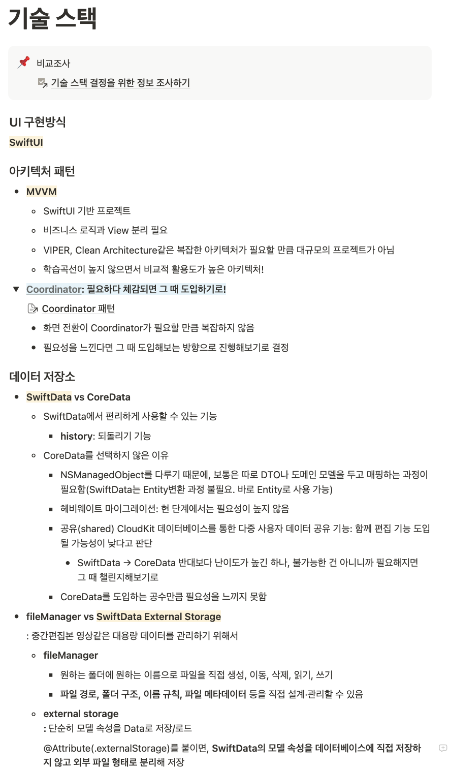 일단 기술스택을 정해야 했다. Apple Academy 내에서 UI 구현은 SwiftUI로 정해져 있었고, 그 외의 것들을 결정해야 했다.
