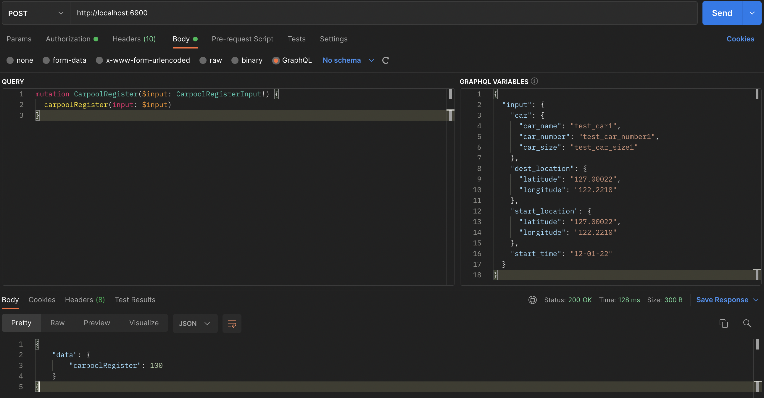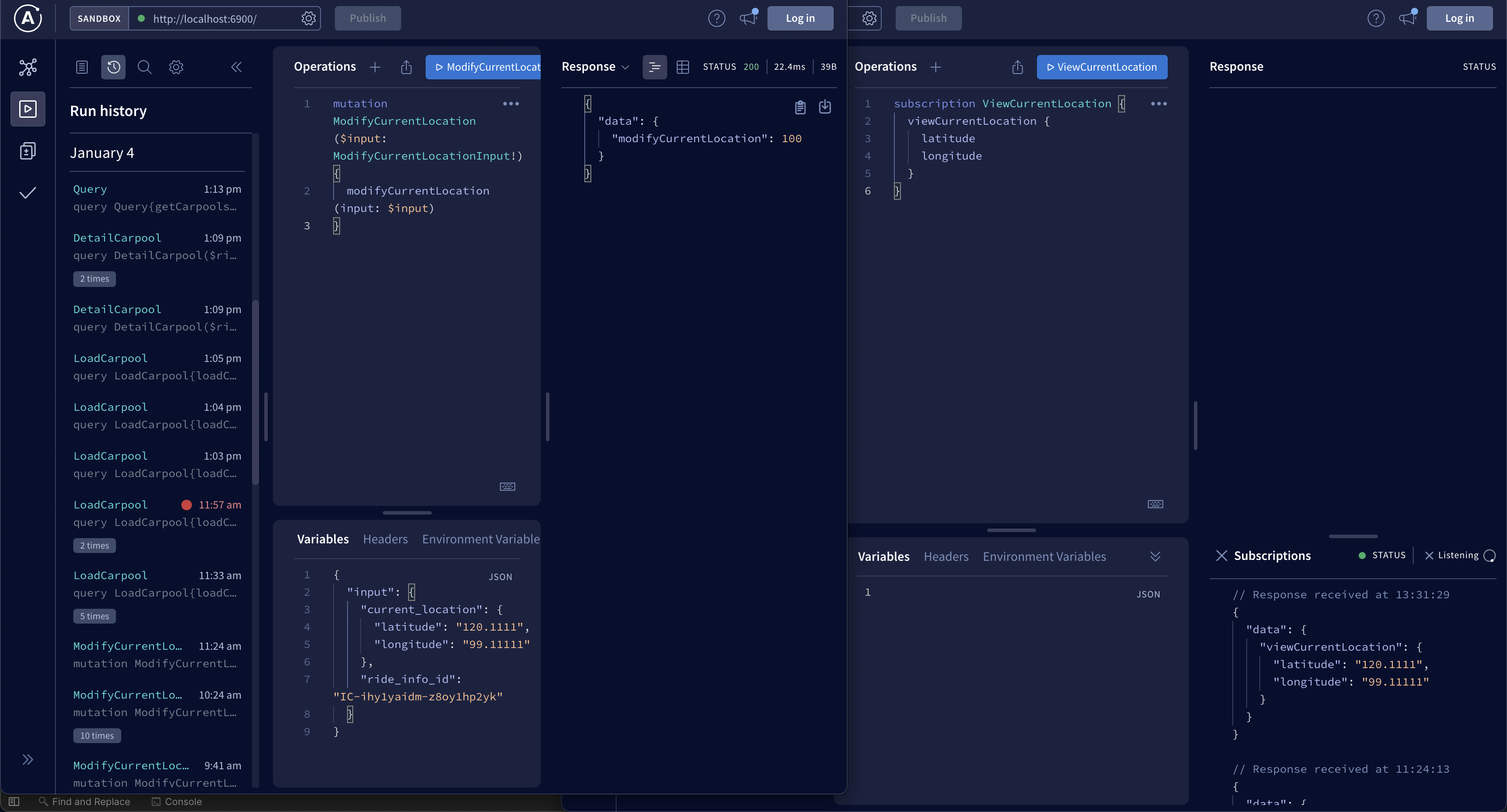 subscription api를 호출하는 모습입니다. 6901번의 서버를 화면과 같이 listening상태로 실행시키고, 6900번의 서버에서 Mutation을 호출한 결과 바로 current_location을 불러오는 모습을 볼 수 있습니다.