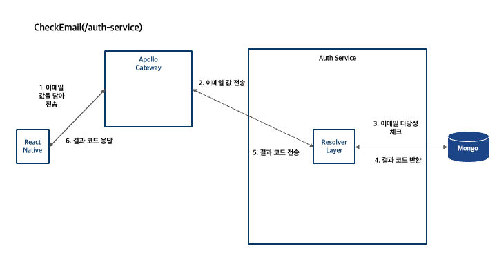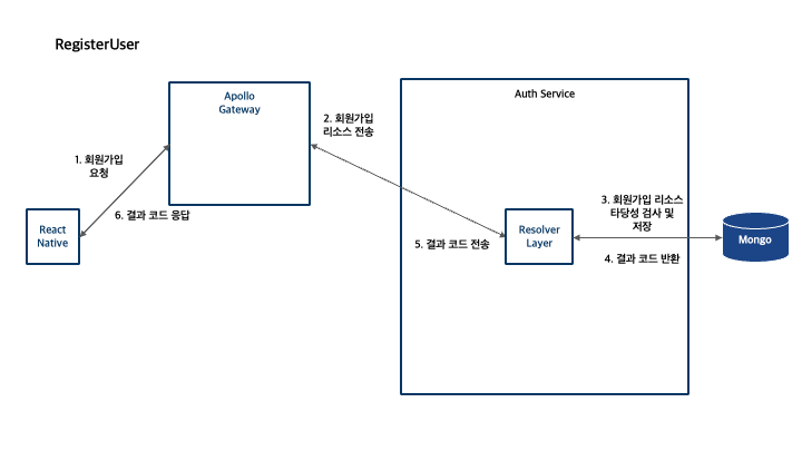 회원가입에 대한 흐름도입니다. 회원가입 요청 시 리졸버 레이어에서 해당 리소스가 타당한 리소스인지 판단한 후 결과 코드를 클라이언트에게 반환합니다.