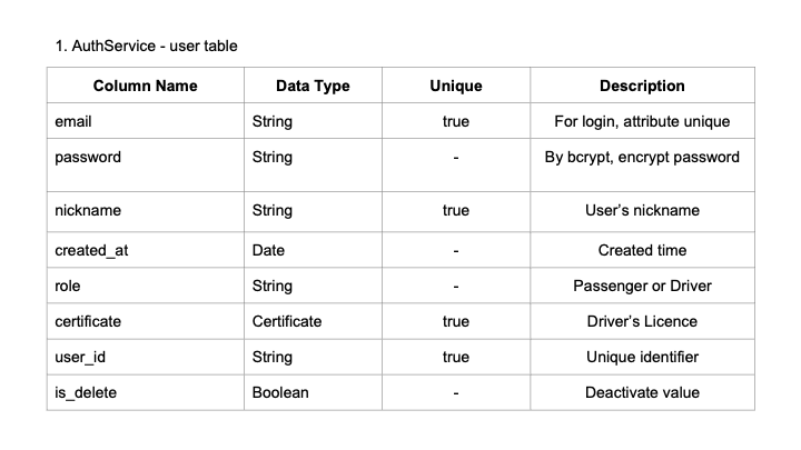 Carpool 서비스에서는 총 2가지의 유저 종류가 필요합니다. 운전자와 탑승객이죠. 때문에 유저 데이터베이스에는 유저의 기본정보를 담기위한 유저 테이블, 운전자 확인을 위한 운전면허증 테이블이 필요합니다. 이를 바탕으로 데이터 모델을 구성하도록 하겠습니다.