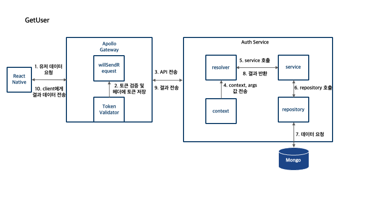 유저 정보를 불러오는 흐름도입니다. 유저 데이터 요청 시 gateway에서 이 토큰이 타당한지에 대한 여부를 확인합니다. 타당하다면 이 토큰에서 user_id를 추출한 후 서비스로 전송합니다. 서비스에서는 이 user_id를 매개로 유저 리소스를 클라이언트에게 반환합니다.