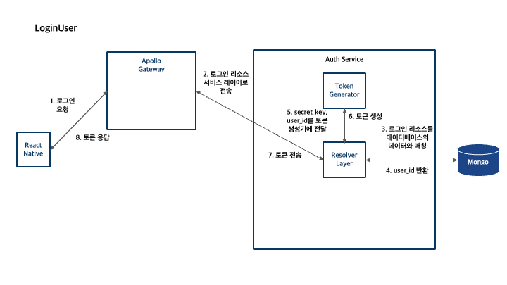 로그인에 대한 흐름도입니다. 로그인을 요청하면 리졸버 레이어에서 요청 리소스를 바탕으로 타당한 데이터인지 판단한 후 user_id의 값을 클라이언트에게 반환합니다.