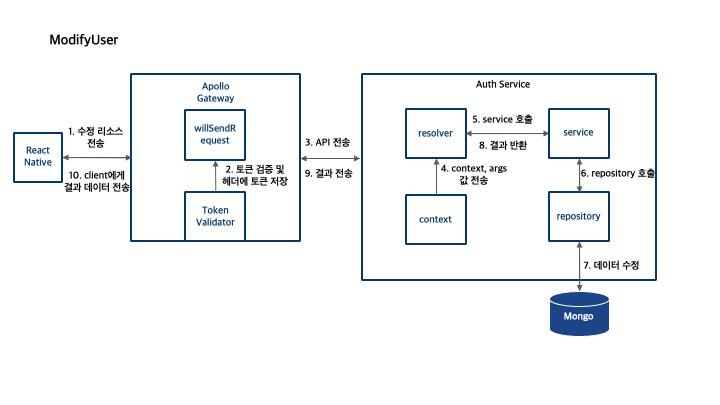회원 수정에 대한 흐름도입니다. 회원 수정 요청 시 gateway에서 타당한 토큰인지 판단한 후 타당하다면 service로 리소스를 전송한 후 비즈니스 로직을 수행합니다. 이후 이에 대한 결과 코드를 반환합니다.