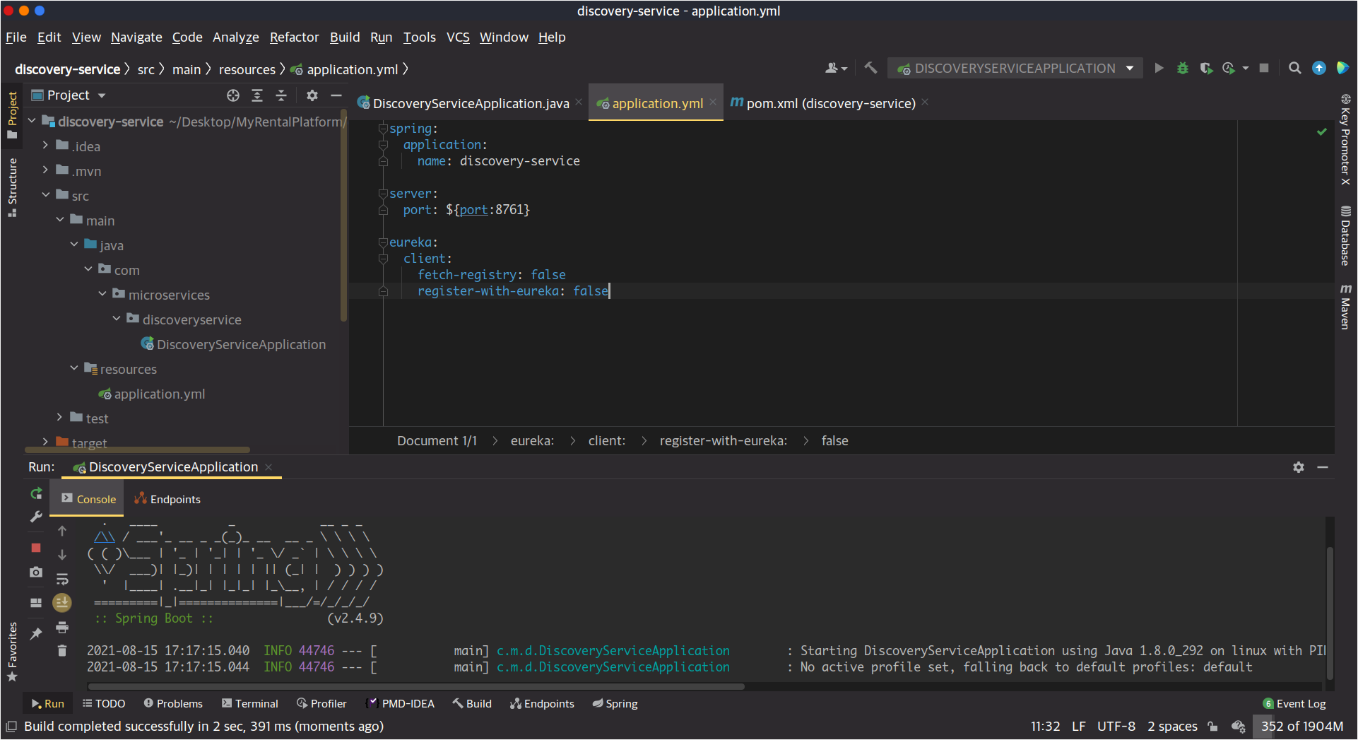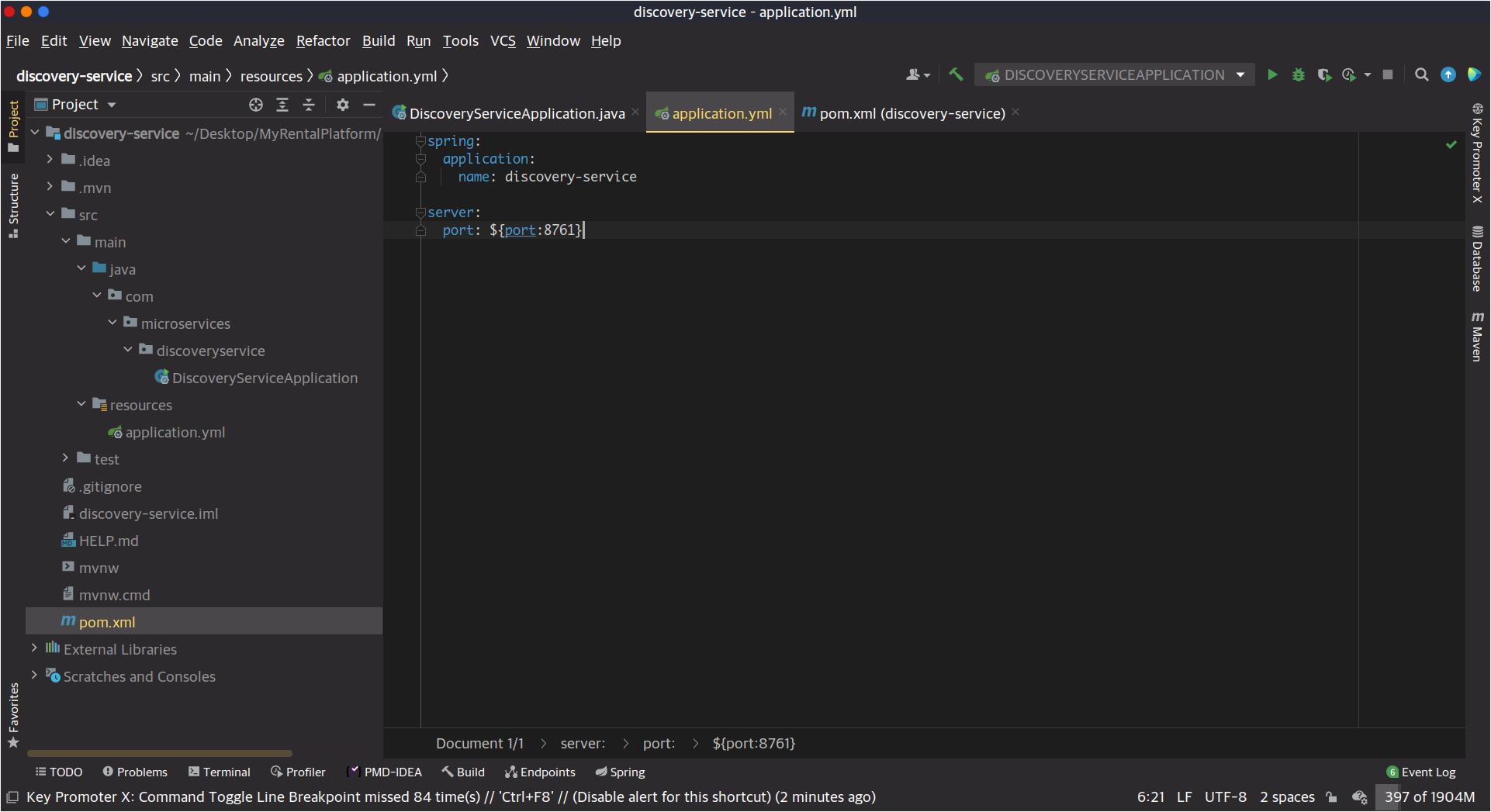그리고 application.properties를 application.yml로 바꿔준 후 다음과 같은 설정을 진행하였습니다. spring.application.name은 해당 프로젝트의 이름을 다음과 같이 명시할 것이란 의미이고, server.port는 다음 포트번호로 서버를 구동시킬 것이다 라는 의미입니다.