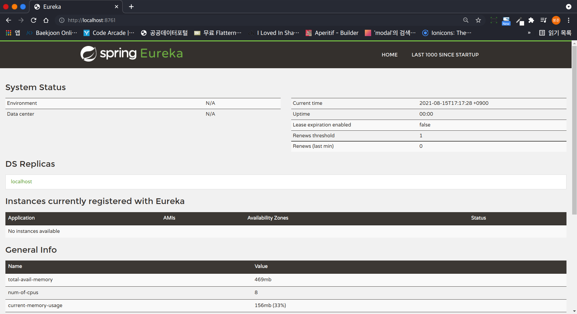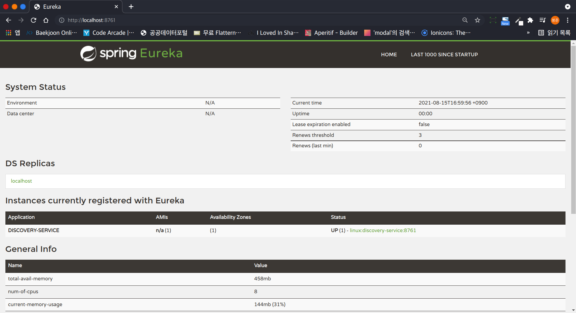 서버를 구동시키고 http://localhost:8761로 접속을 하게 되면 해당 페이지가 뜨게 되고 discovery-service가 클라이언트로 등록이 되는 모습을 볼 수 있습니다. discovery-service는 서버로 구동될 프로젝트이기 때문에 application.yml 파일에서 설정을 주어 클라이언트 등록을 없애도록 하겠습니다.