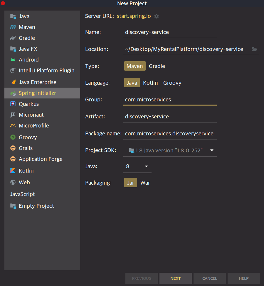 저는 앞으로 모든 서비스의 디렉토리 구조를 com.microservices.* 형태로 맞출 예정이기 때문에 com.microservices로 group을 설정하였습니다.