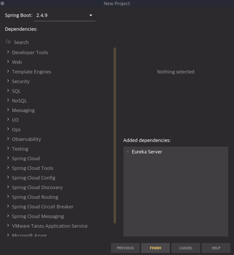 Spring Boot의 버전은 2.4.* 대 버전으로 맞추어 진행하고 Eureka Server 디펜던시를 추가하도록 하겠습니다.