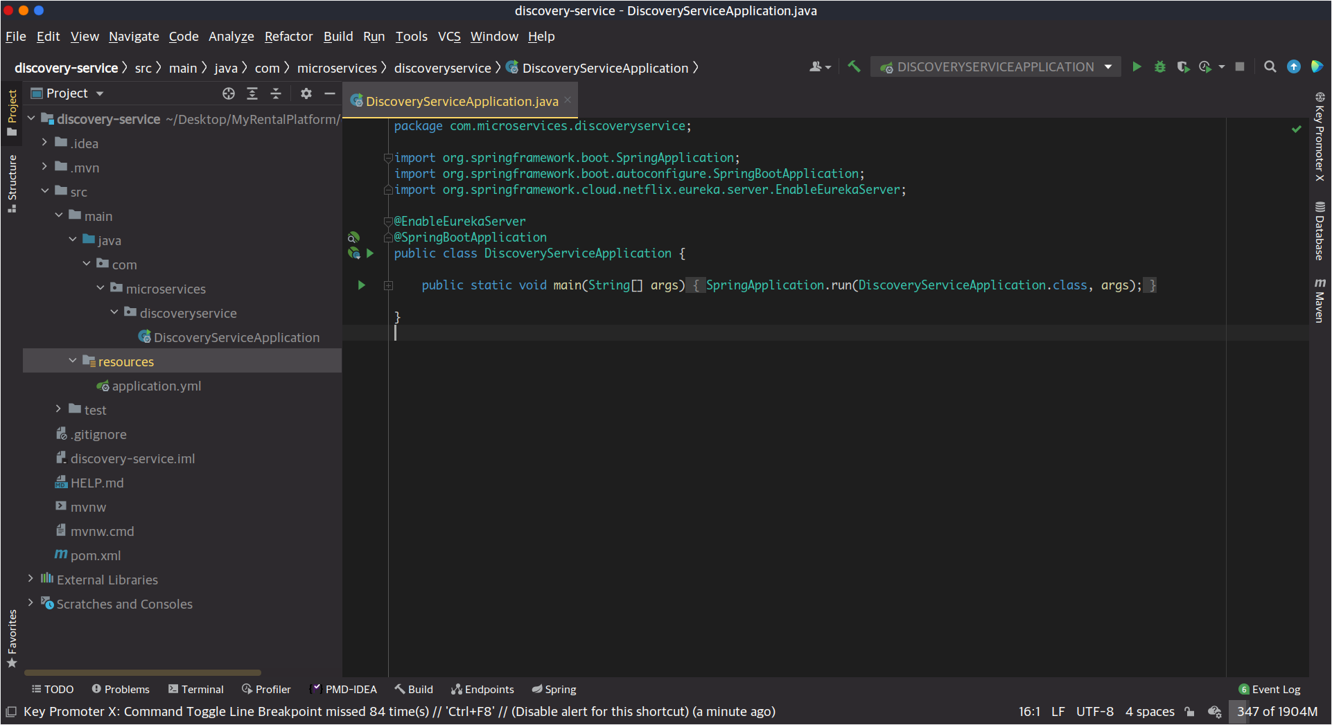 프로젝트를 생성하시면 화면처럼 디렉토리 구조가 생성이 되고 DiscoveryServiceApplication 클래스 파일에 들어가 EnableEurekaServer 어노테이션을 달아줍니다. 이 어노테이션은 해당 프로젝트를 Eureka Server로 사용하겠다라는 의미의 어노테이션입니다.