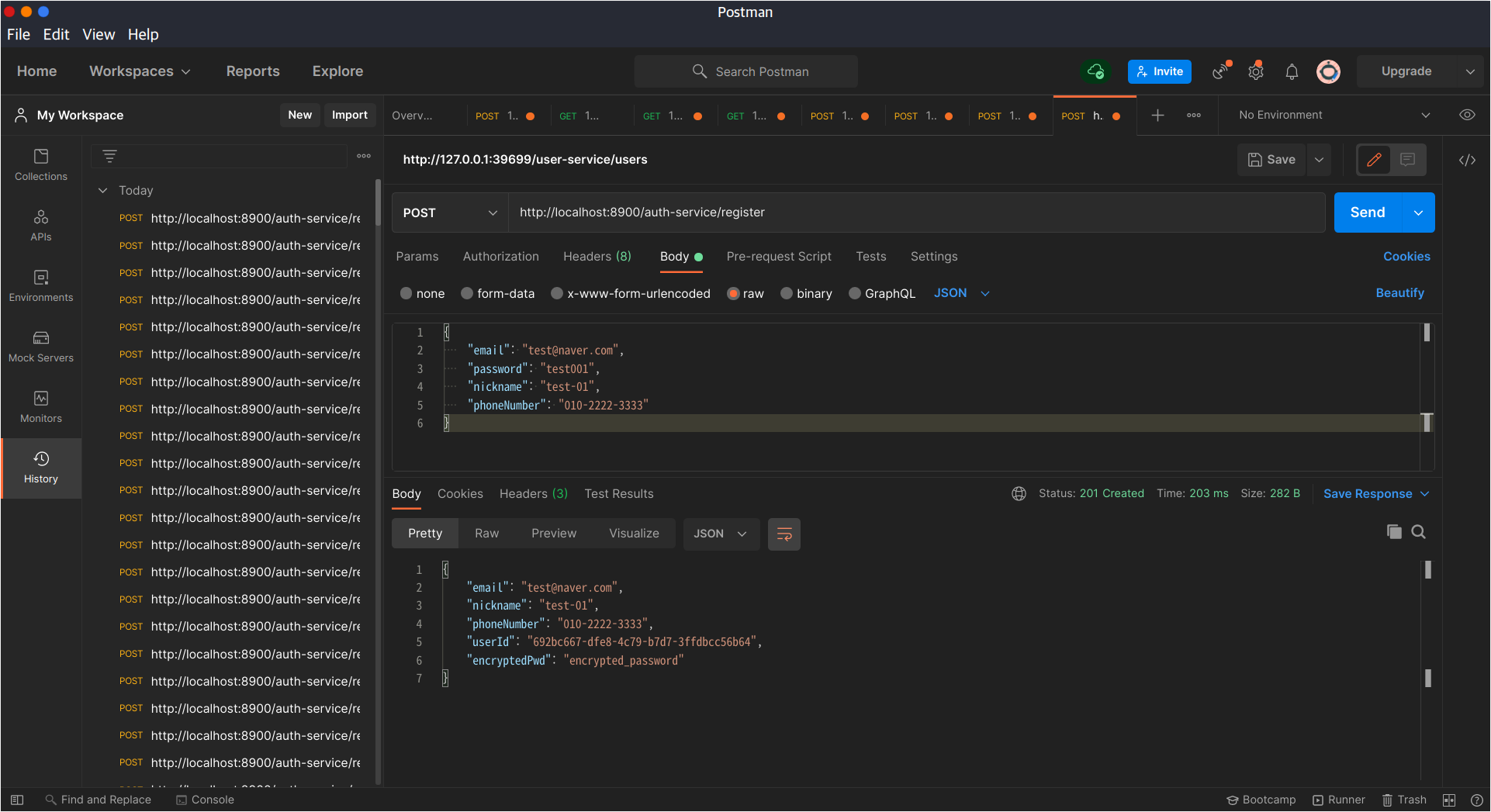 그리고 Controller에서는 UserDto를 반환하는 authService.registerUser(UserDto) userDto 객체를 생성하고 이 UserDto객체를 이용하여 반환값으로 ResponseUser와 201 Created를 반환합니다.