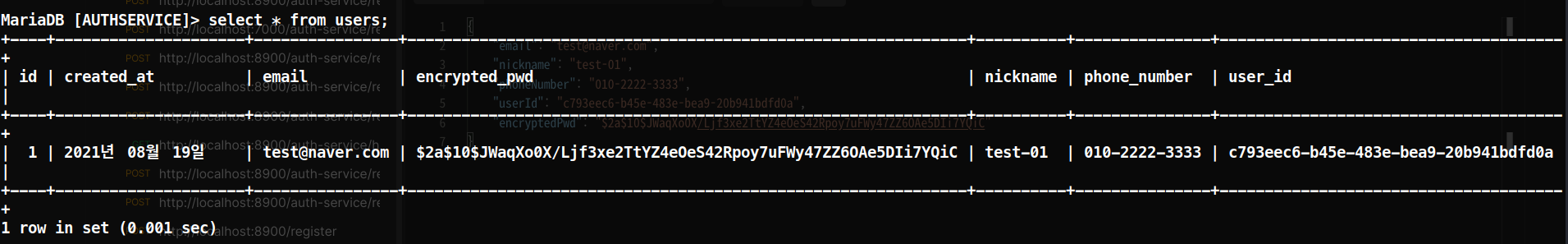 postman요청 그리고 반환값을 확인할 수 있으며, database에도 잘 저장되어있는 모습을 살펴볼 수 있습니다.