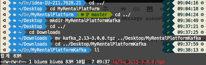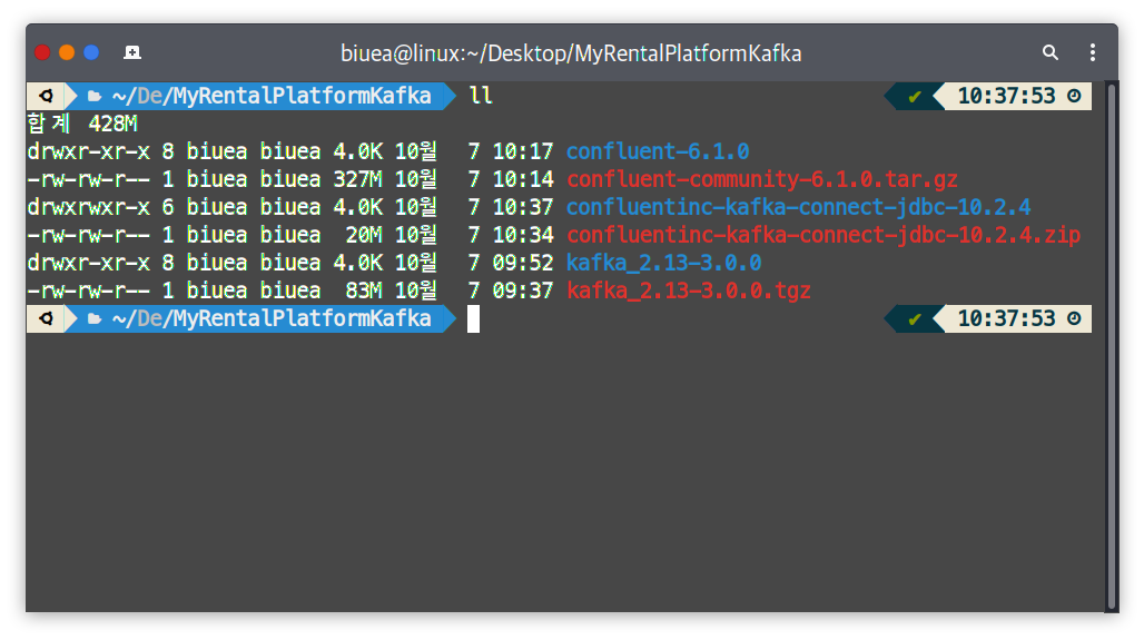 그리고 다운받은 zip파일을 kafka 디렉토리로 옮기고 압축을 해제하도록 하겠습니다.