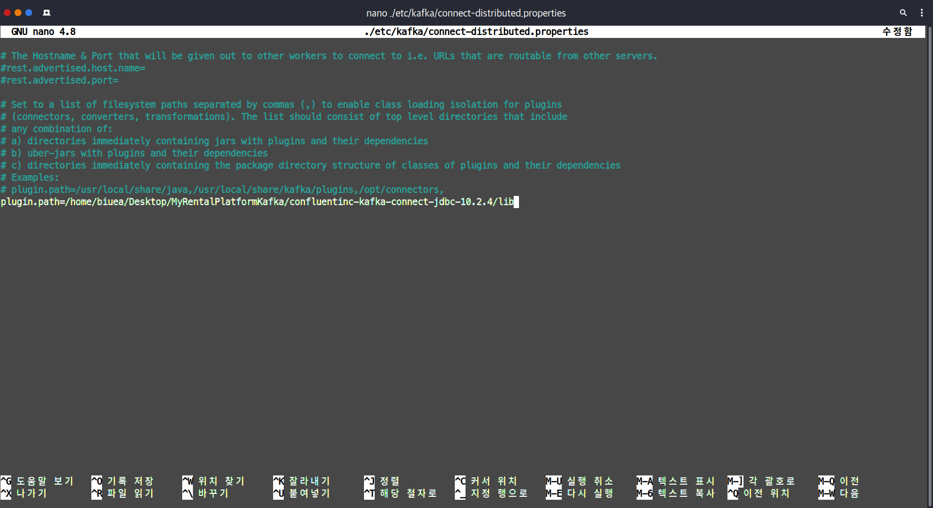 압축을 해제한 파일/lib 경로를 복사해서 confluent-6.1.0/etc/kafka/connect-distributed.properties에 붙여넣도록 하겠습니다.