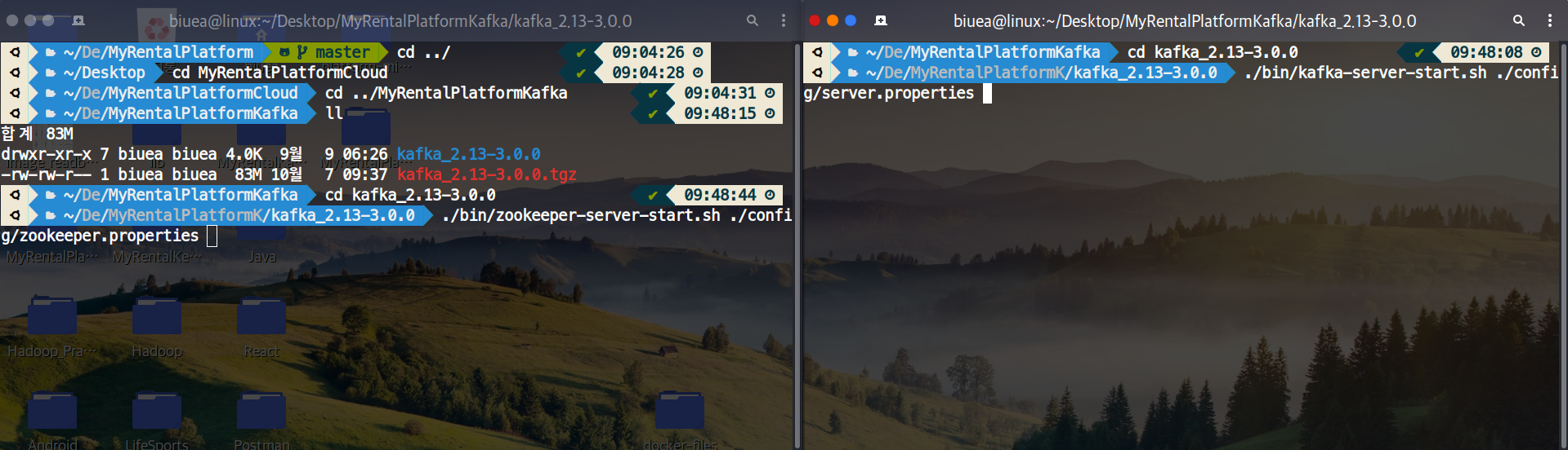 터미널을 2개로 만들어 다음의 명령어들을 이용해 kafka, zookeeper 서버를 실행하도록 하겠습니다.