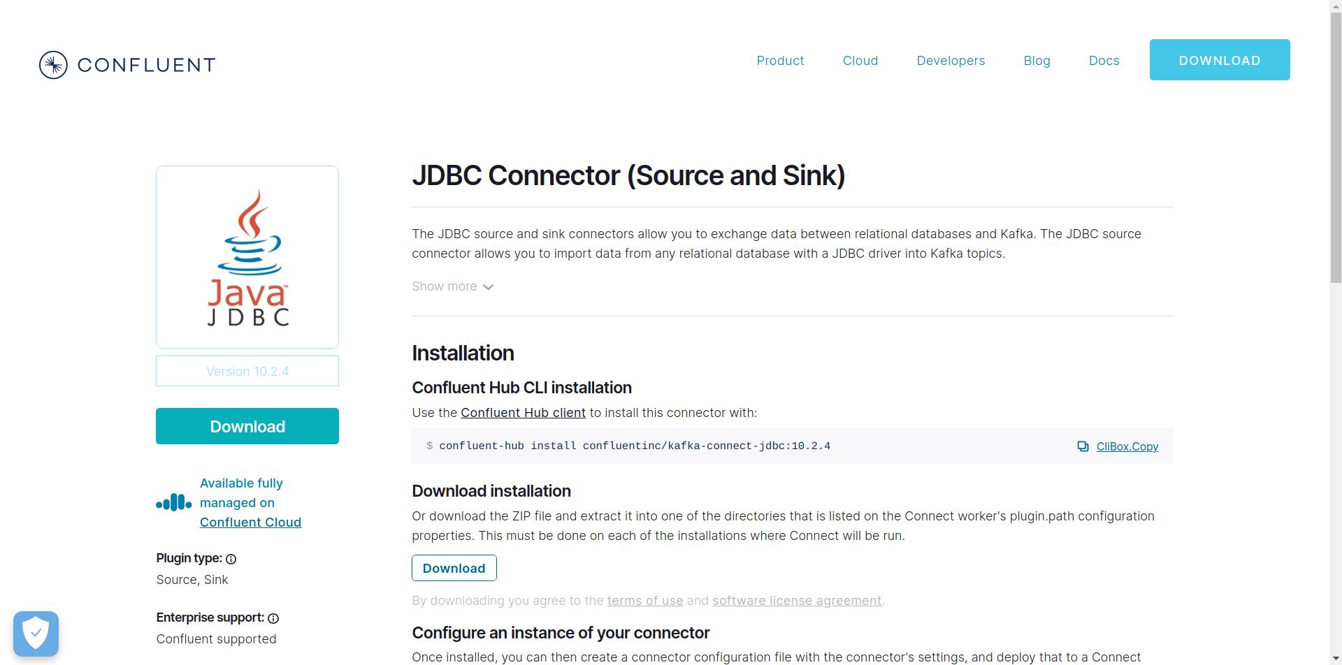 https://www.confluent.io/hub/confluentinc/kafka-connect-jdbc 사이트에서 Download 버튼을 누르면 zip파일을 다운받을 수 있습니다.